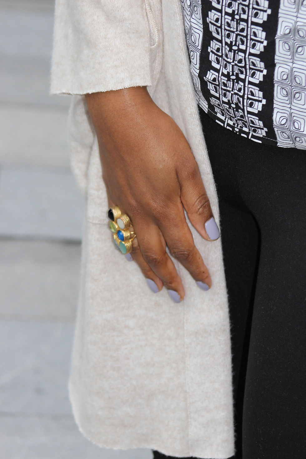 With this look I am playing mainly with block neutrals, to breakup the monotony, I am inducing graphic print with the blouse. A fun edge is combined by adding a pop of colour with the shoes and nail polish.